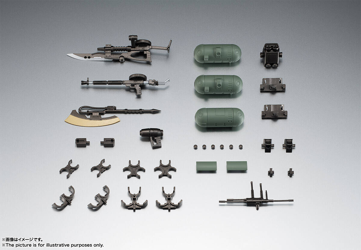 銃剣が特徴的なM-120ACザク・マシンガン、大型ヒート・ホーク、長銃身の120mmザク・マシンガン、ピストル型パワーツールを新造形。