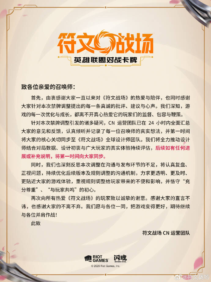 关于《符文战场:英雄联盟对战卡牌》本次禁牌调整相关情况说明与公告