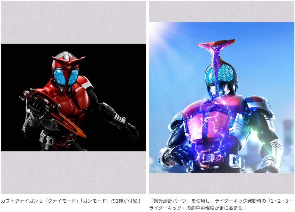 劇中のカラーリングを再度解釈し定義しなおし、装甲の赤メタリックの色味を再現。カブトならではの構え専用の手首パーツも付属するため、天に向けて指を指す決まり手ポーズを再現可能!