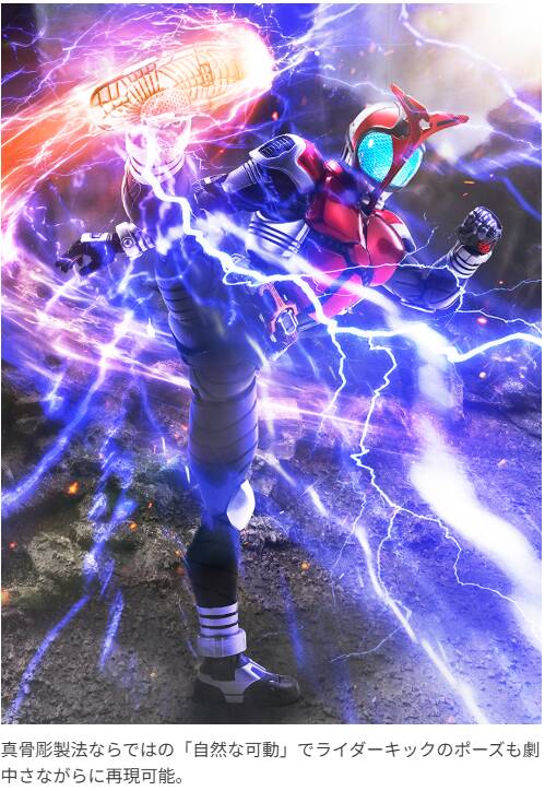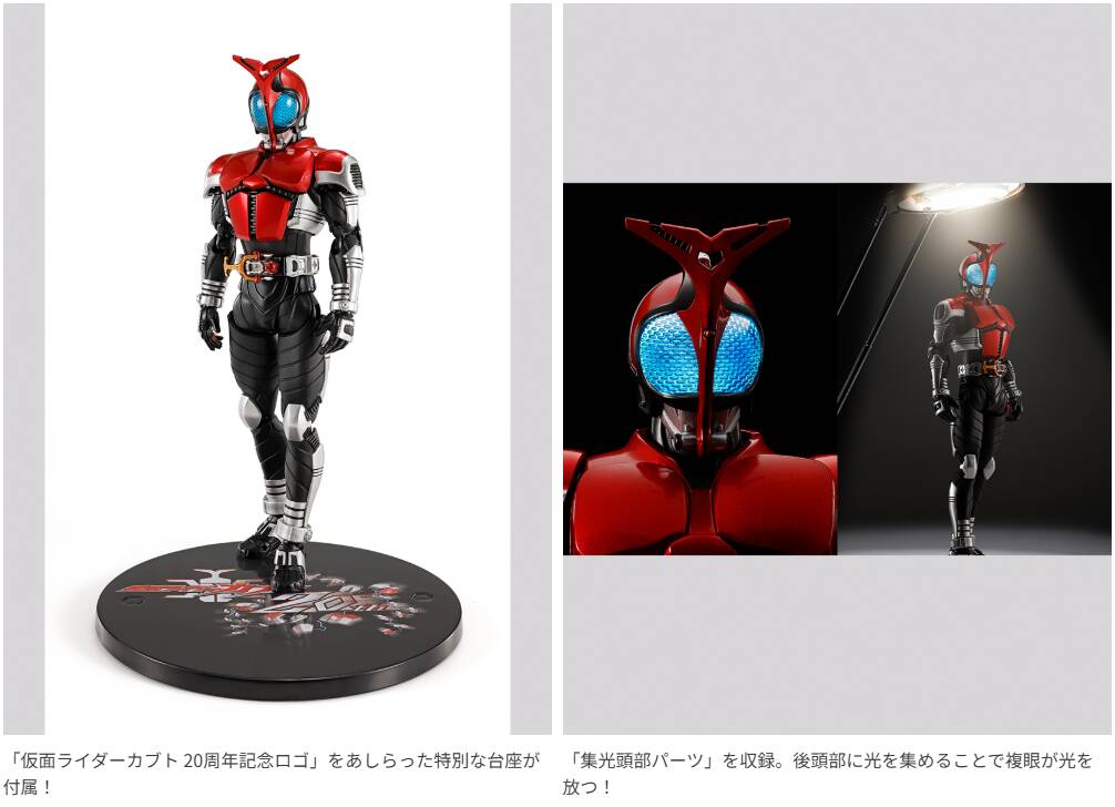 劇中のスーツの色を再度解釈し、2014年発売の「S.H.Figuarts(真骨彫製法)仮面ライダーカブト ライダーフォーム」、2024年発売の「仮面ライダーカブト ライダーフォーム 真骨彫製法 10th Anniversary Ver.」とは異なるカラーリングで再現!集光頭部パーツや20周年記念デザインの台座を備えた特別仕様に“進化”して登場‼