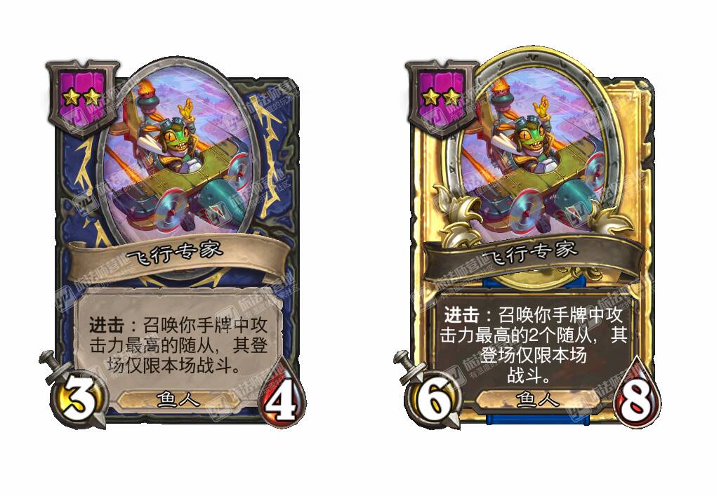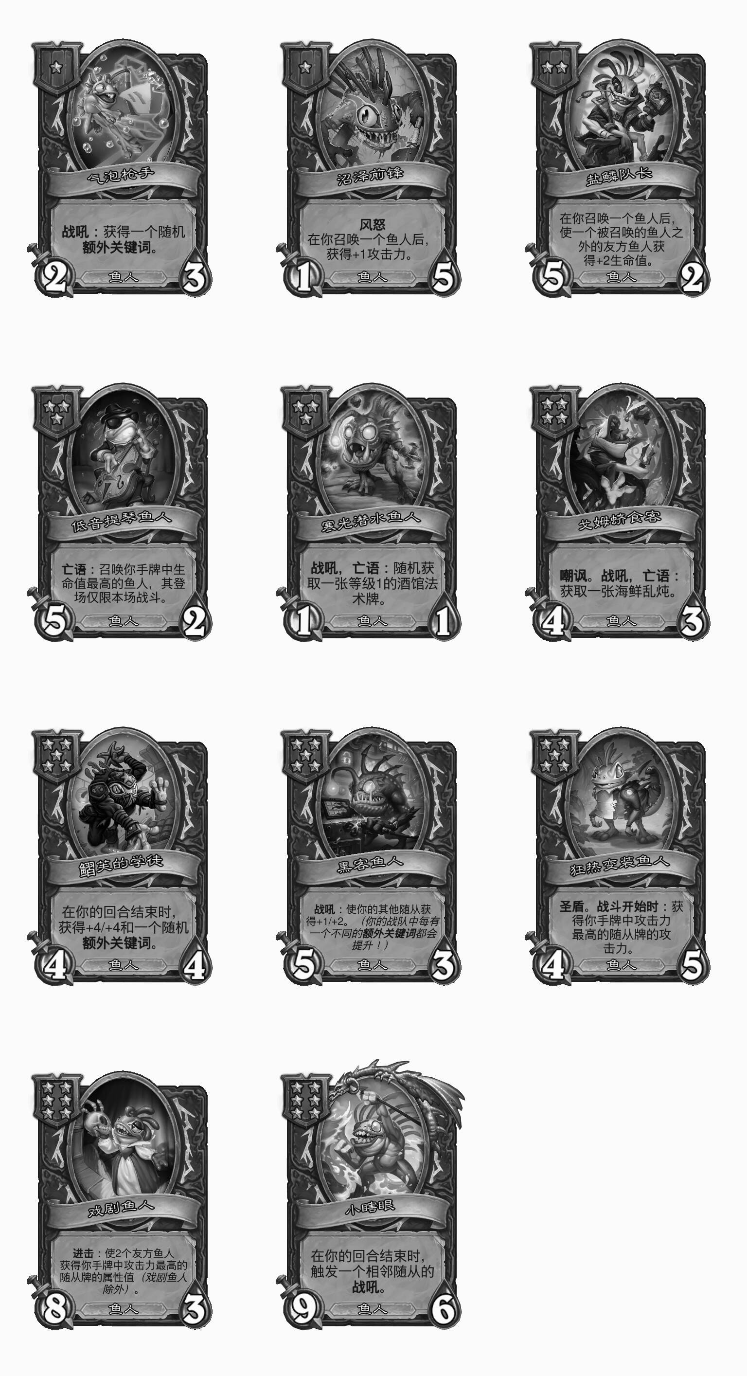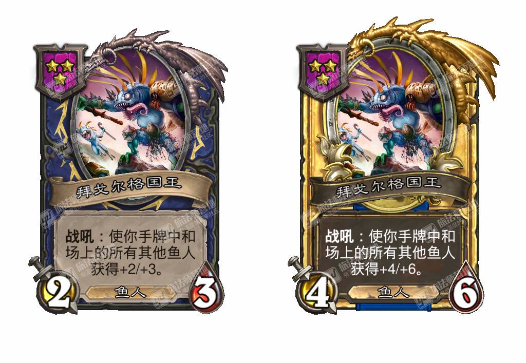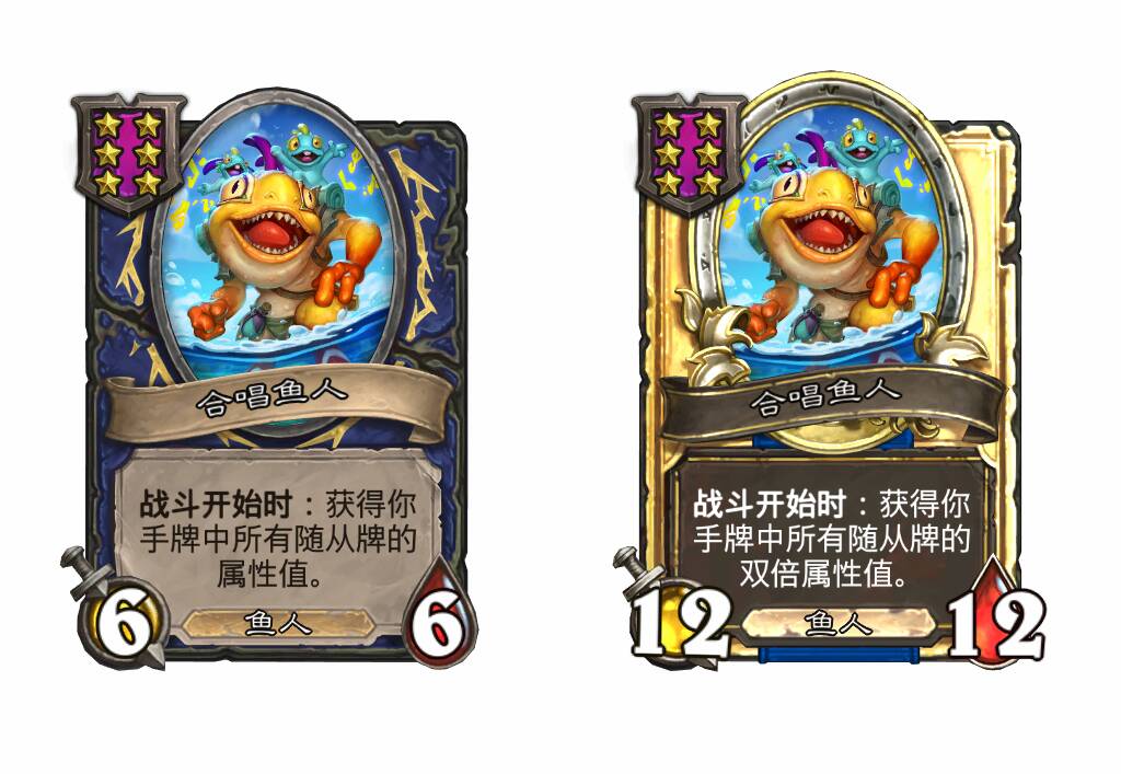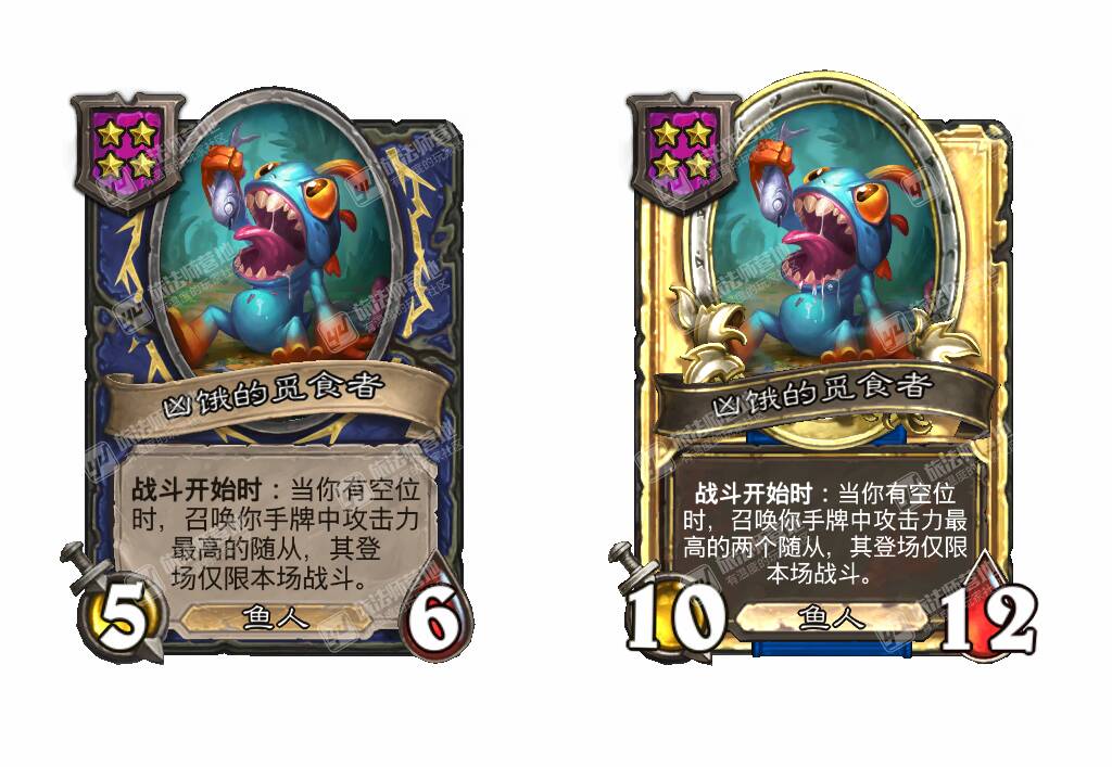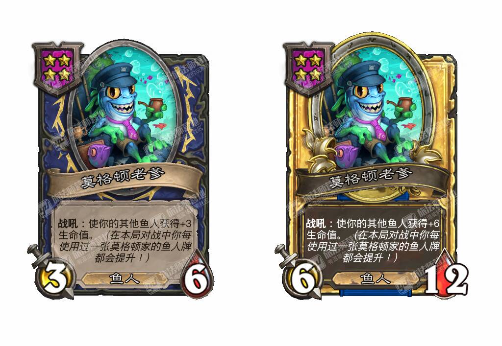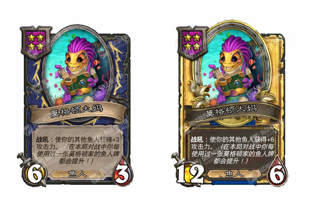 - [4星6/3鱼人] 战吼:使你的其他鱼人获得+3攻击力。(在本局对战中你每使用过一张莫格顿家的鱼人牌都会提升!)