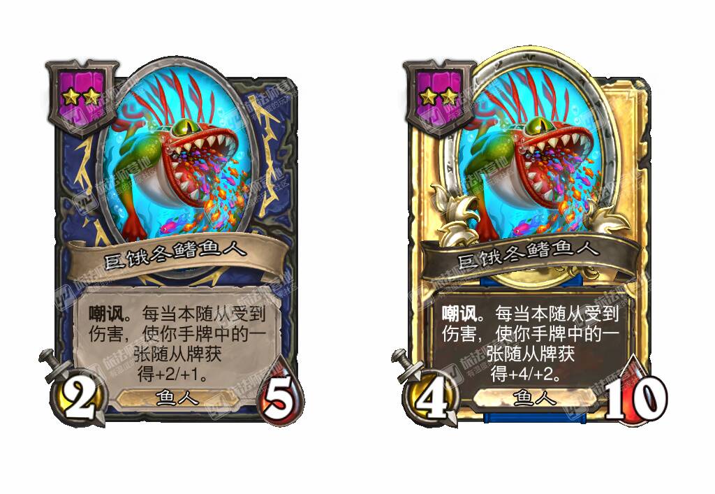 - [4星3/6鱼人] 战吼:使你的其他鱼人获得+3生命值。(在本局对战中你每使用过一张莫格顿家的鱼人牌都会提升!)
