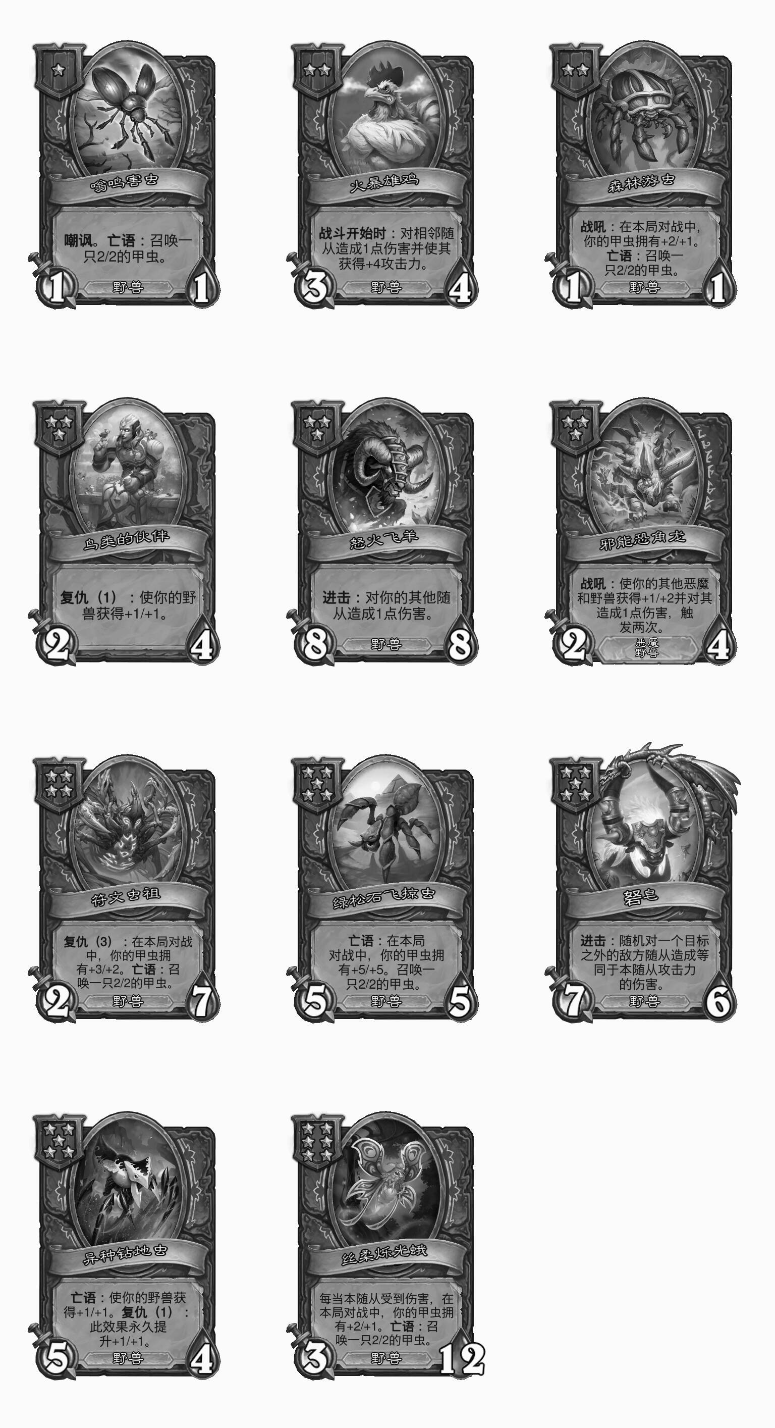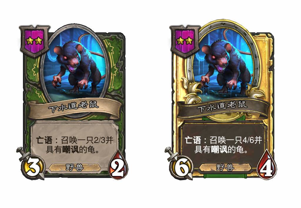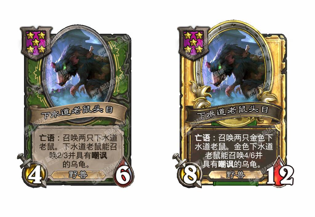 - [5星4/6野兽] 亡语:召唤两只下水道老鼠。下水道老鼠能召唤2/3并具有嘲讽的乌龟。