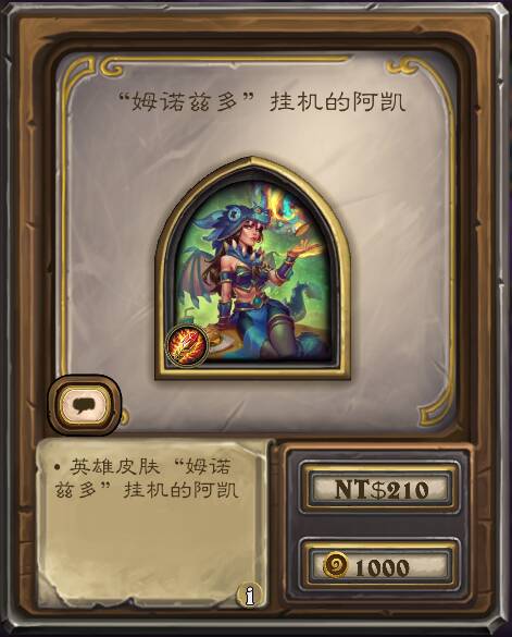 含构筑模式法师“新”皮肤““姆诺兹多”挂机的阿凯”,售价1000金币或42符文石(国服)/6.99美元(外服)。