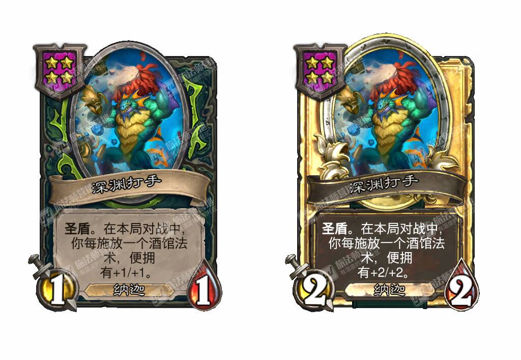 - [4星1/1纳迦] 圣盾。在本局对战在,你每施放一个酒馆法术,便拥有+1/+1。