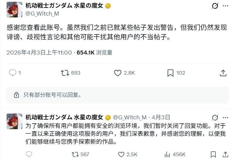 本作于2022年10月至2023年7月播出,是《机动战士高达》系列中争议较大的一部作品之一。其中,关于两位女性主角之间同性关系是否属于“正史”的问题,一直是粉丝讨论的焦点。随着作品迎来三周年纪念,围绕剧情及创作者的争议在社交媒体平台上似乎进一步升级,不过官方并未具体说明这些恶意评论的内容。