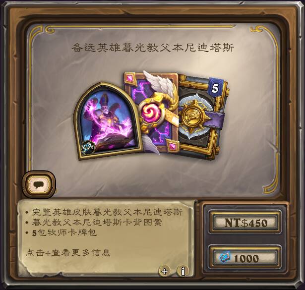 含构筑模式牧师新皮肤“暮光教父本尼迪塔斯”及其配套卡背,和5牧师包,售价600奥术宝珠(国服)/1000符文石(外服)。
