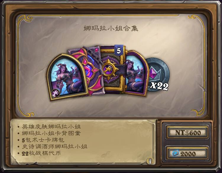 含构筑模式术士新皮肤“娜玛拉小姐”及配套卡背,5术士包,战棋模式新酒保“娜玛拉小姐”,和22代币,售价1280奥术宝珠(国服)/2000符文石(外服)。