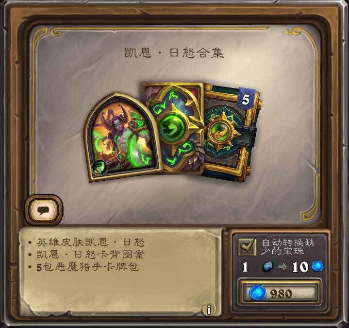 (国服)构筑模式恶魔猎手新皮肤“凯恩·日怒”及其配套卡背,售价980奥术宝珠(国服)。