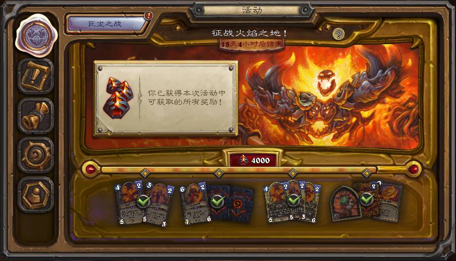 (如试玩所示)新的火焰之地主题的限时活动将于北京时间4月15日随新版本一同上线,持续到5月6日。奖励共计普金毁焚火凤、怨毒焰魔、始源领主三张礼物牌,德鲁伊新皮肤“火焰之地的玛法里奥”,幸运币异画“萨弗拉斯”,和2裂变包。