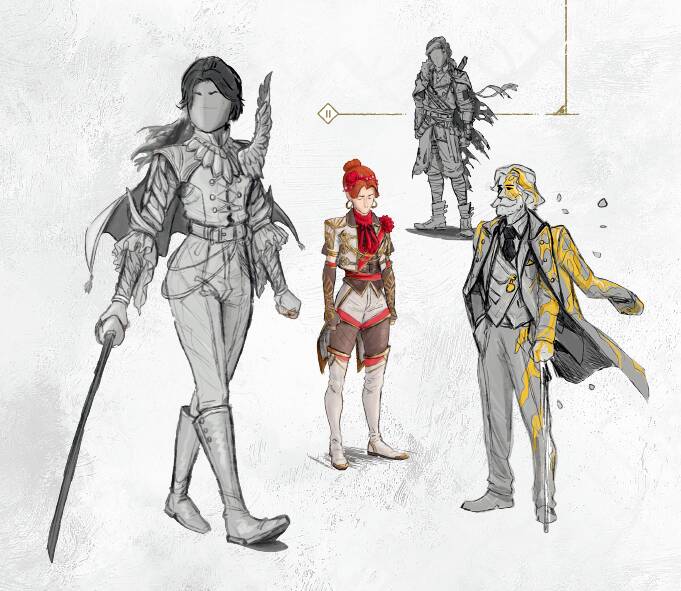 书中还收录了海量未曾公开的创作手稿与概念图,可以看到设计师们是如何利用Houdini开发“卢明建筑工具”,生成整片奥斯曼风格与装饰艺术风格融合的街道。也可以欣赏到早期版本中身穿红披风的远征队形象,一步步演变为最终那套极具几何感的黑金配色制服的。