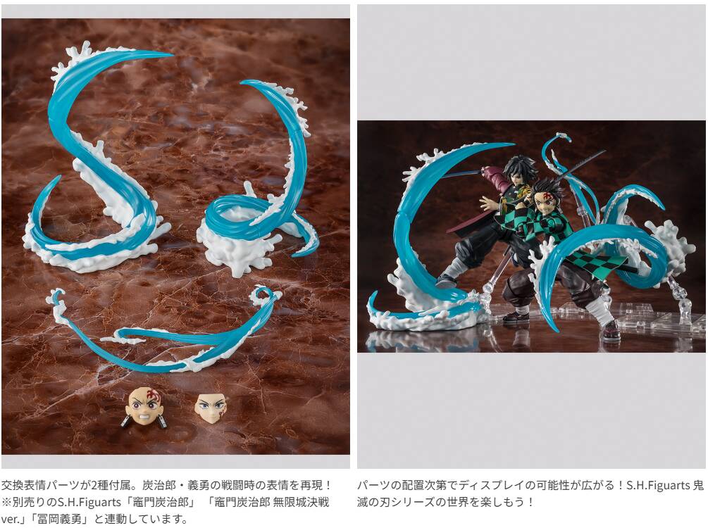 S.H.Figuarts 鬼滅の刃シリーズの世界観を広げる「水の呼吸エフェクト」に、炭治郎と義勇の交換用表情パーツが付属。表情パーツとエフェクトパーツの組み合わせで、様々なシーンを再現可能!