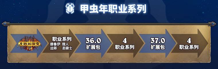 如图所示,每个拓展包中期各有四个职业的职业系列——有一个职业会得到双份,具体还未公布。在时间上,职业系列和迷你系列一样随.4补丁上线;在卡牌数量上,职业系列比普通迷你系列少,如35.4这次共计4*7+1张中立=29张牌,而迷你系列往往38张。在价格上,职业系列的2500金币对标的是星际英雄传,比普通迷你系列贵(但紫卡倒也更多)。这些牌的实际表现能否对得起涨价,就要拭目以待了。