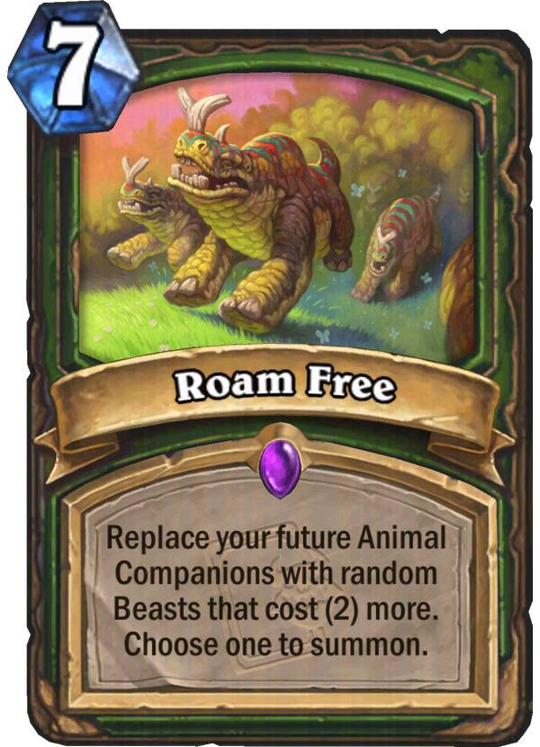 将你此后的动物伙伴替换为法力值消耗增加(2)点的随机野兽牌。选择一个并召唤。