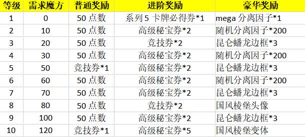 另外,竞技场通行证也同步开启,根据大家获得的魔方数解锁对应档位的丰厚奖励,包括系列5卡牌、Mega分离因子、竞技券等!