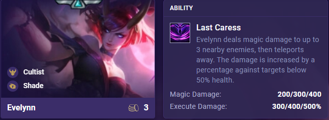 各位老哥大家好,我是HuyaBucky,在昨天简要分析了S4机制变化之后,我在今天投入了大量时间(排队)测试了各种阵容,其中的一张3费卡让我很是兴奋,她就是伊芙琳,在我测试的猩红之月阵容和刺客(吃铲子)阵容里,寡妇都占据着主C的位置,刺客寡妇也好,猩红主C也罢,只要给她一些AP装备诸如大帽子法爆蓝BUFF正义之手,寡妇这种一巴掌三个小朋友的快乐,你也能感受得到。