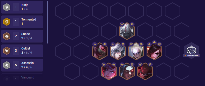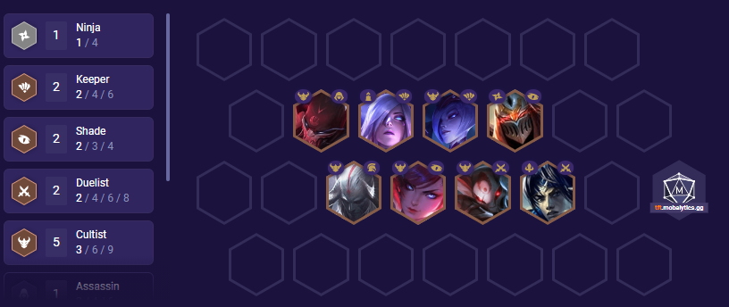 为什么我要使用刺客寡妇呢,这个赛季的刺客是自带法爆的,阵容里比较强悍的输出阿卡丽,男刀,卡特都可以,但是阿卡丽和男刀是单体,卡特虽然是AOE但是90蓝条相比寡妇长,在转大的时候也容易被凯南这种团控控到打断,相对来说寡妇是刺客阵容里比较全面的收割强的AOE,我自己经过尝试,决定推荐这套必要一个铲子的阵容。