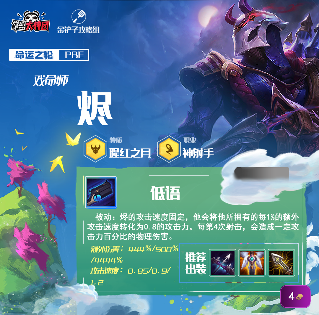 当前版本最弱四费子,蓝条太长,技能非常不稳定,纯挂件子,坐等设计师加强。