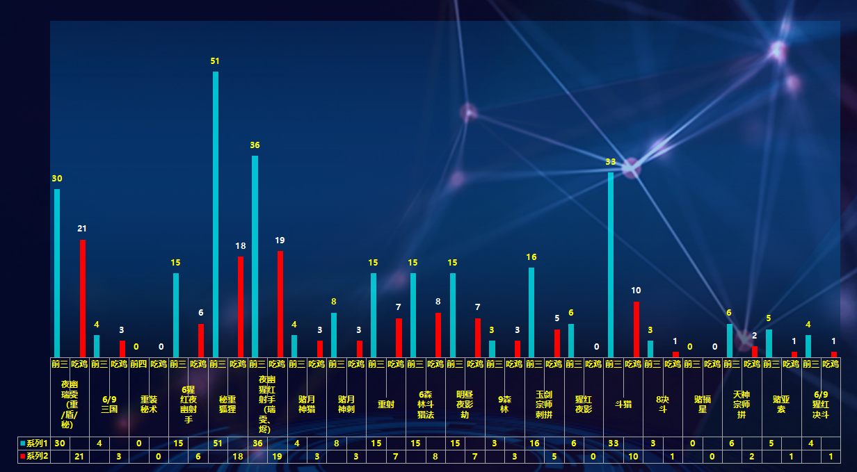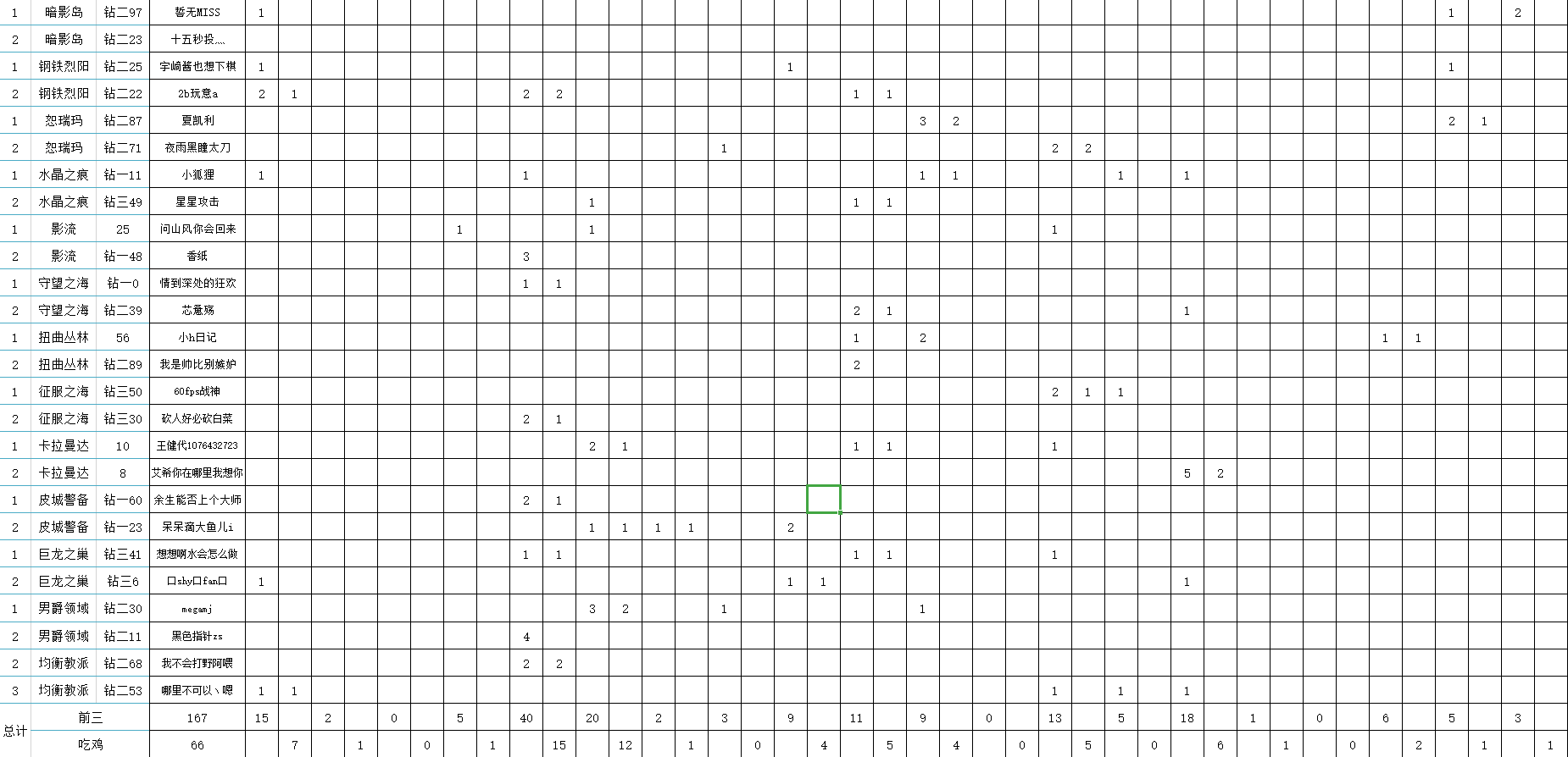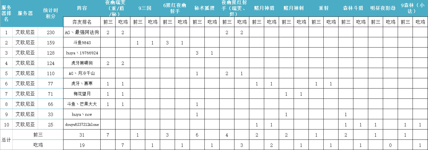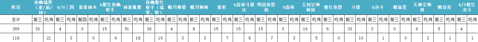 斗猎阵容双榜均为第四,吃鸡10场,前三33场,吃鸡比重30.3%