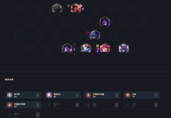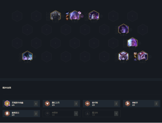 统计420场游戏对局,共进入前三名场次为269场。其中前三场次最高的阵容为秘重狐狸体系阵容51场,占前三场次的18.9%,占全部场次的12.1%。前三场次第二阵容为夜幽猩红射手(瑞雯、烬)36场次,占前三场次的13.3%,占全部场次的8.5%。前三场次第三阵容为夜幽瑞雯(重/盾/秘)体系阵容共30场次,占前三场次的11.1%占全部场次的7.1%。