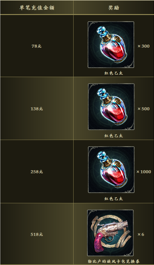 活动期间,单笔充值达到指定金额,可获得奖励如下: