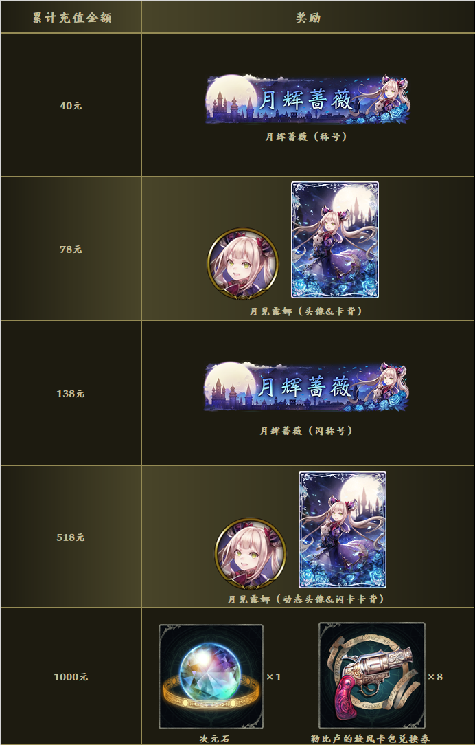 为庆祝国庆中秋佳节,将开启特别累计充值活动——月辉蔷薇,累计充值达到指定金额,将可以获得网易特约画师梅鲁老师绘制的月见露娜(动态头像&闪卡卡背)及月辉蔷薇(闪称号)奖励!