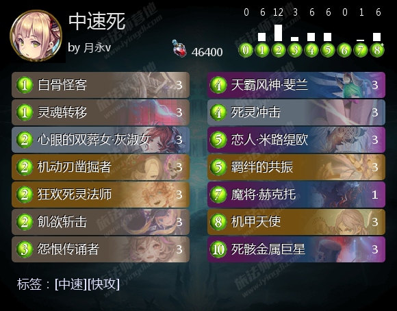 其他组件,例如大狐狸,布丁,紫妹等组件,可搭配世界,放弃恋人,组成一套偏控制的中速死,用于降速。例如暗影收割者,漆黑的恶灵等组件,可用于提速,减少灰夫人等卡位。具体根据环境酌情使用。