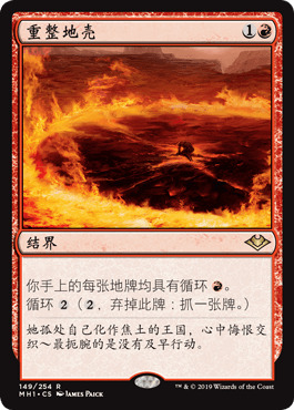 首先,套牌的核心肯定是全新观点无疑,而它的功能也相当简单易懂:只要全新观点在场且手中有大于等于七张牌,所有的循环牌就都可以免费循环。不过这个效果虽然可以快速过穿牌库但并不能自己制胜,所以这里就需要其他的组件来最终达成胜利,而这也是这套牌与以往全新观点组合技最大的不同。如上所述,原版全新观点底色是苏勒台色组,依靠抽血和回收循环牌制胜,但这套牌改为铁木尔色组,且完全抛弃了抽血回收体系。这一改变基本上完全来源于两张史迹加入的单卡:重整地壳和塔萨的先知。
