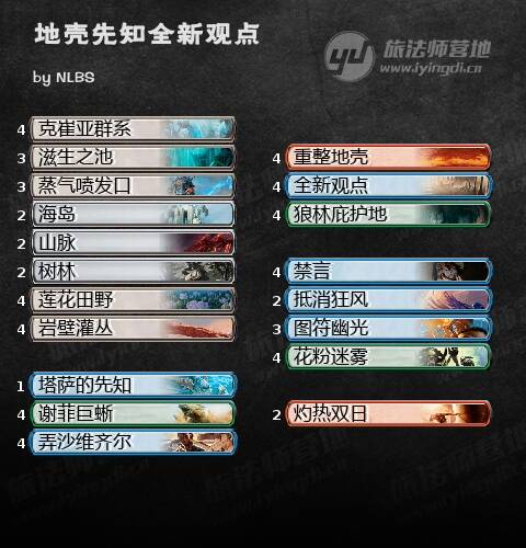 先说重整地壳。这张来自摩登新篇的结界为这套牌带来的最大帮助显而易见:有它在场,所有的地牌都具有循环异能,而这意味着两件事:首先,最重要的是全部地牌带循环让新版全新观点可以正常地进行配地,而不必再像旧版那样带上一大堆只沾一色的循环地,法术力基础的稳定性获得了几乎可以说是飞跃式的提升。同时,这也使进一步压缩套牌中非循环牌的数量,进而不再依赖坟场阴影的资源回收成为了可能。这套牌中,考虑重整地壳异能的影响,全部60张牌不能循环的单卡总共只有9张,分别是四张全新观点,四张狼林庇护地,和一张塔萨的先知。这之中全新观点在组合技开始时必定会拍下去一张,而狼林庇护地前期经常会拍下至少一张,只要组合技过程中施放图符幽光抓一次牌就可以保证一回合之内抓空牌库斩杀。