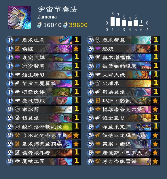我是在八月份看到日报里的一套偏中速的宇宙龙法后产生了构筑宇宙节奏法的念头。九月摸索了一个月后基本构筑完成并于10月16日成功打上传说(10星,全程使用该卡组)。由于全程未开插件,只有随身炉石传说的对局数据,现整理如下:(42-16,胜率72.4%)