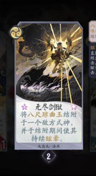 无尽剑狱:大岳丸核心卡之一,再不带三勾战斗卡的情况下,大岳丸的三勾战斗力抢血能力较低,这时可以放弃大岳丸,用无尽剑狱封住对方核心式神来取得三勾的优势对局。