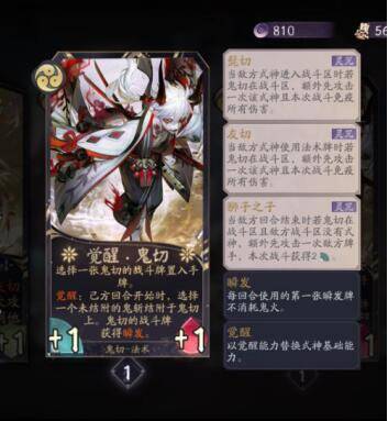 因为鬼切觉醒后,多鬼斩果,配合狮子之子可以打出爆炸输出,鬼切觉醒拿牌效果,一般是推荐拿鬼切三勾战斗牌,因为这个直接打牌手可以在不与对方站场的情况下让鬼切站场,配合其它战斗牌可以打对手一个措手不及。