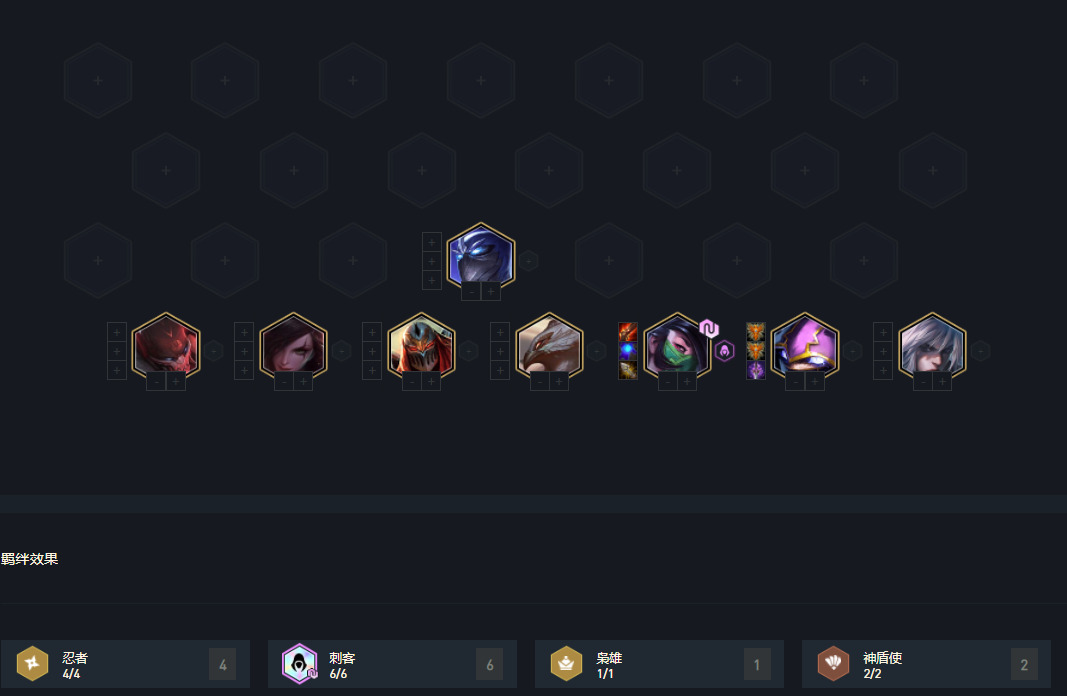 4忍者为阵容核心阿卡丽提供超高攻击与法强,让阿卡丽面板属性质变,利用火炮、蓝霸符、无尽来极限增加阿卡丽技能伤害,让阿卡丽拥有一个技能秒杀一个棋子的超高爆发能力。有刺转搭配6刺,没有增加小羁绊,来增强全队输出。