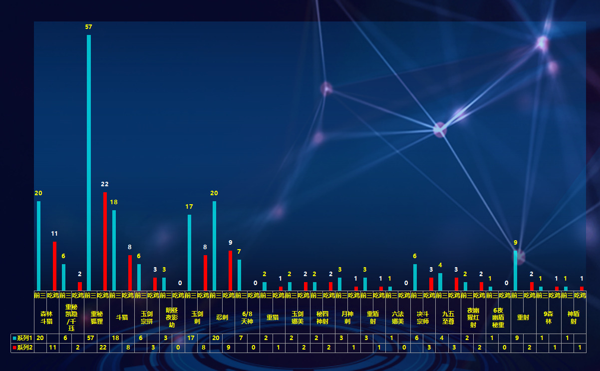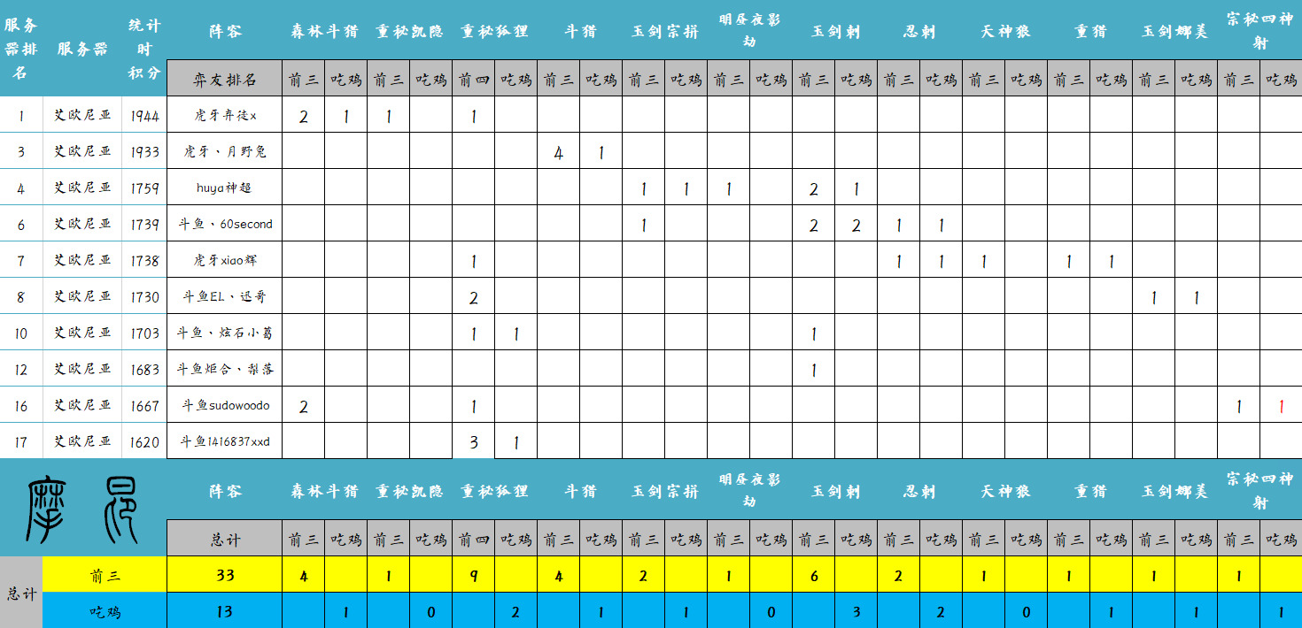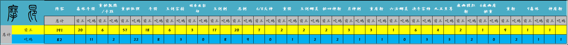 此次统计中玉剑刺阵容,前三场次17场,吃**场,吃鸡比重47%(吃鸡场次/前三场次)。外网数据统计排行吃鸡率8.8%,平均排名4.51(大师以上数据,)