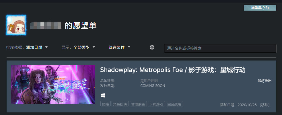 添加《影子游戏》到愿望单,截图回复在本帖中就可参与抽奖 ,截图中需包含个人的Steam昵称,重复回复无效,我们会在11月2号抽出对应奖品数量的幸运玩家送出奖品。
