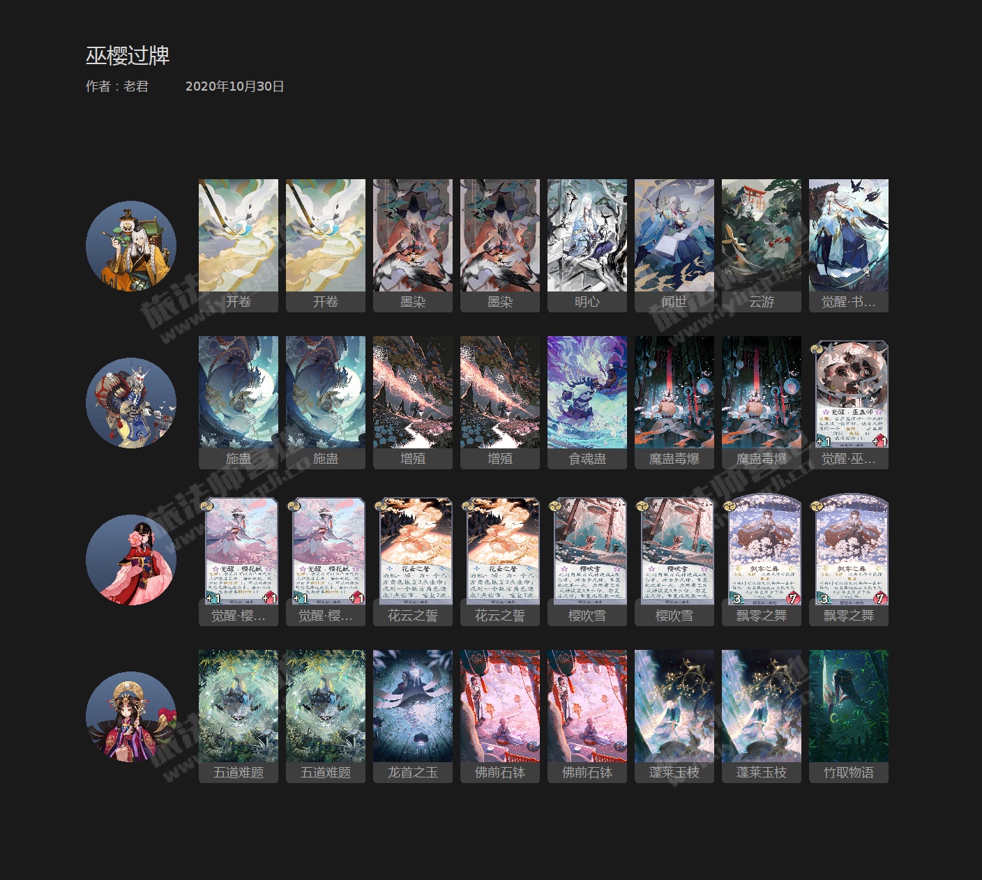 大家好,我是老君。今天推荐的卡组是一套书翁过牌卡组。卡组思路承袭“烟辉”,核心过牌组件依然是书翁和辉夜姬的蓬莱玉枝,但是控场组件由烟烟罗、妖琴师替换成了巫蛊师、樱花妖。在之前的日报中有一个巫蛊师控场卡组,运用到的就是巫蛊师+樱花妖的控场组合,并且也详细地讲述了巫蛊师+樱花妖为什么可以替换烟琴组合。从定位上讲,烟烟罗是解场和苟血,妖琴师是控制和返场。那么恰好巫蛊师也能做到解场和苟血,樱花妖在控制和返场上显然表现得要比妖琴师出色。那么巫蛊师+樱花妖的体系在理论上是完全可以取代烟琴体系的。烟琴体系的优点是什么呢?解场丰富,己方式神身材可抬,三勾后有稳定的战斗区保护手段。但是这略微与佛前石钵冲突,虽然这套卡组中辉夜姬作为幻境独苗,很容易被解掉,但是巫蛊师能提供对敌方式神的身材削减,在中期能与佛前石钵形成更好的配合。巫蛊师与樱花妖是对儿老搭档了,以这两名式神为基础的卡组我写过好多了,因为他们太搭了。前中期巫蛊师削减身材不仅是对场面的控制,更是为三勾释放完美樱吹雪做准备。在有书翁这个全环境最强过牌组件的辅助下,巫蛊师和樱花妖也更容易拿到核心牌。目前天梯已经有很多同类卡组,这套卡组在面对中慢速卡组时发挥十分出色;如果牌序优秀,面对蛇鹿快攻也有不错的发挥。