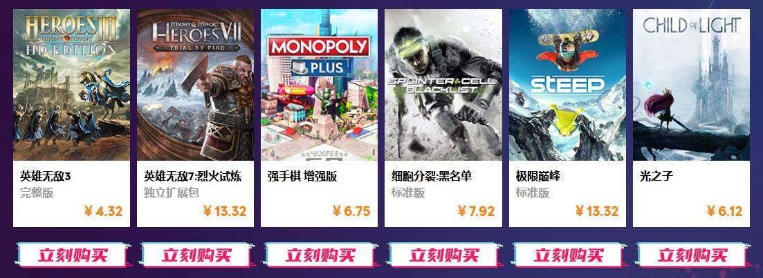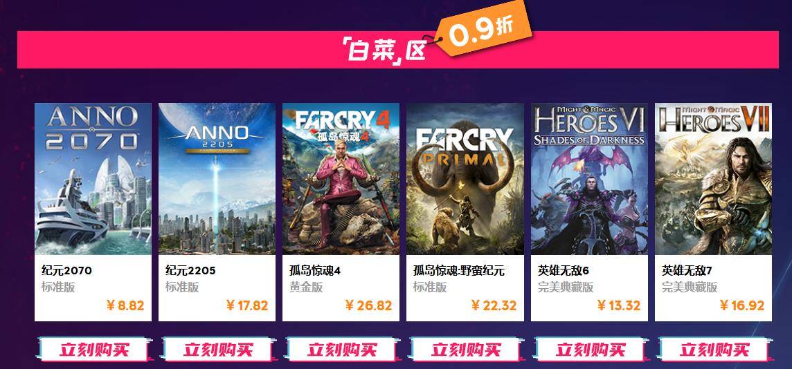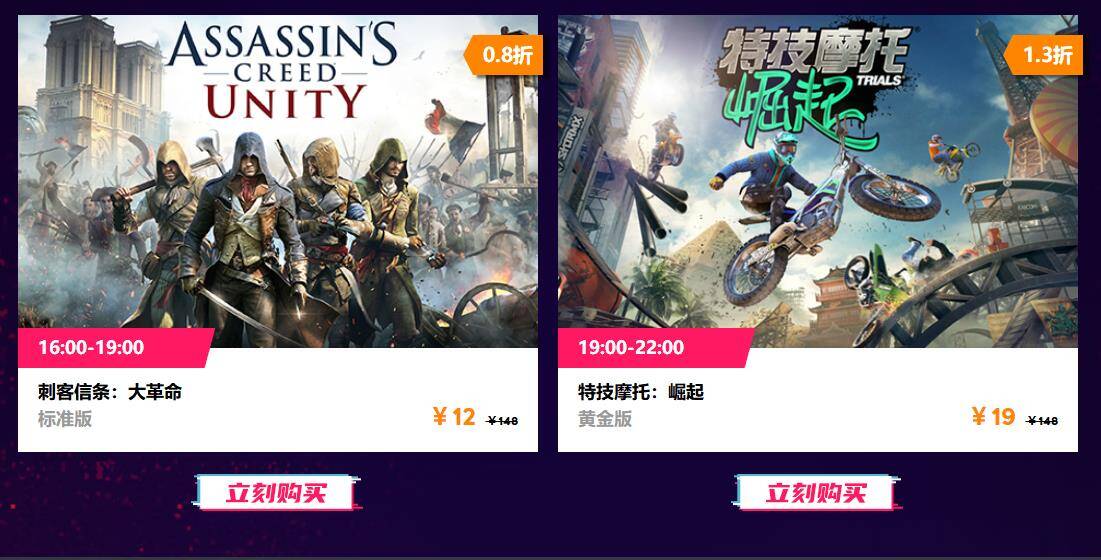 还有“今日闪购”活动,《刺客信条:大革命》(12元)《特技摩托:崛起》黄金版(19元)全都白菜价。此外《孤岛惊魂》系列以及《英雄无敌》系列多部作品均有0.9折超低折扣,喜欢的不要错过。