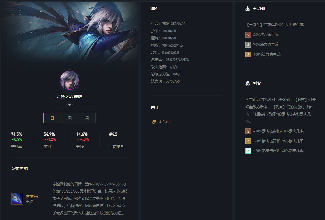 技能属于物理伤害(不会被伏击眩晕),可暴击,超高的单体爆发伤害,2星无装备技能伤害162*225%+250=614,携带无尽拥有2刺羁绊下技能伤害{(162+15)*225%+250}*(150+30+10)=1231。