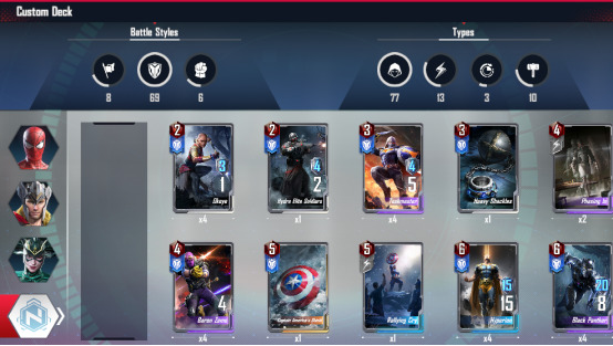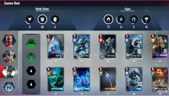 仙宫防御流也是漫威对决比较传统的流派,这套牌可以利用索尔去获得强大的战力,也可以利用“风暴战斧”,消耗掉护甲对所有敌人打护甲一半的伤害来清理场面。在固定卡组中有可以直接增加护甲的“角蝰”,还有作为光环增加护甲的浩克和劳非,很容易可以给一个角色增加大量的护甲,和风暴战斧配合造成全场几十点的伤害。