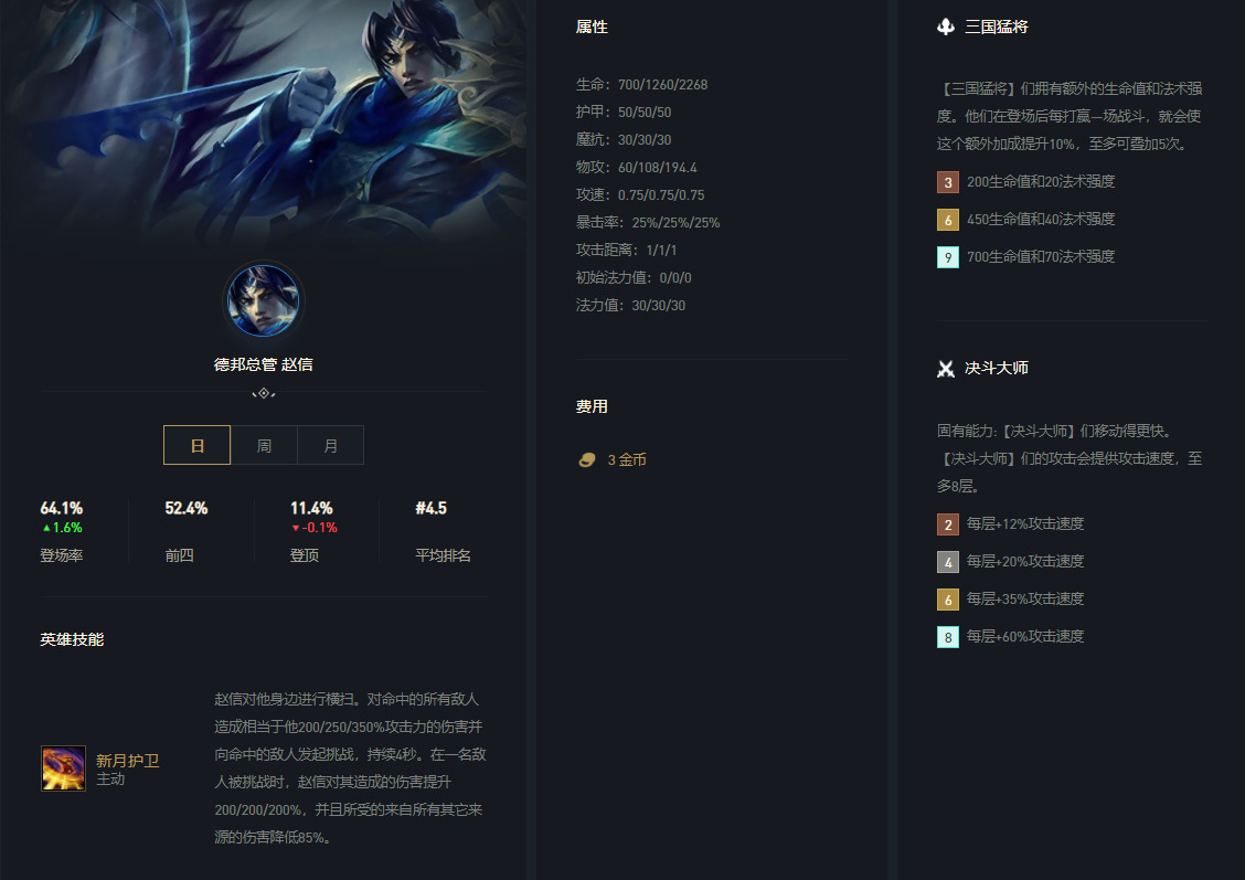 赵信的强度在于技能,在决斗羁绊下超高攻速与3倍伤害,让赵信能2刀一个小朋友,而技能带来的超高减伤让其坦度异常优质,携带饮血剑回复生命更让其如虎添翼。