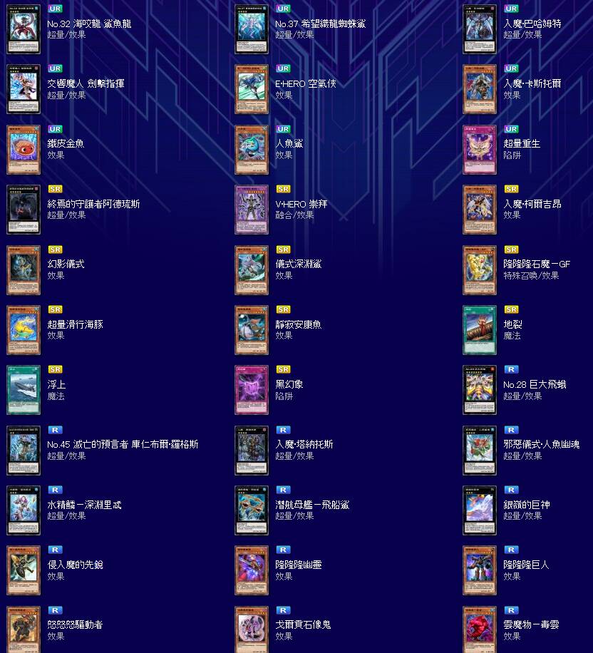 K社公布了第32主卡盒的卡表,和之前推测一样,在鲨鱼活动中登场的NO32是封面。除此之外,还收录了之前黄金包限定的英雄卡、鲨鱼获得中的各种鱼、新的入魔系列卡片以及众多超量怪兽。本卡包还收录了蛇头、我怒隆系列的卡片,以及各种水属性系列的加强卡,正好把之前因为没有超量出不了,但是实际上又没有用的卡出了。当然,遗式深渊鲨和幻影、铁皮金鱼、超量苏生、浮上以及传奇限制卡地割还是很强的。本次的入魔系列收录了北河、双蛇杖这样的关键卡,虽然没有核心入魔龙祖,但是基本上可以玩了。