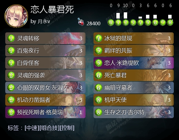 冰狱的显现 的数量可调整。替换为死灵冲击。 也可与天霸风神·斐兰 混着带。能提高上限(跳风神等于0费抽1)。但同时复活个风神就会降低自身的解场能力。携带冰狱的显现的理由是为了拿455,为恋人复活5+1坑爹时,留一个保险。复活一个455也能进化双解+回血。同时4+2时表现比凿掘者+灰夫人更佳。同时,后手4C单出一个455进化双解对抢血思路而言也是一个烦人的动作。