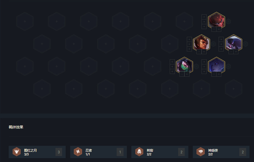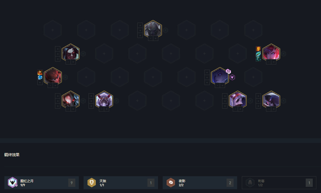 在2阶段野怪之前只要能拿到猩红天选就可以走此套阵容,通常用3猩红2神盾2刺过度。如果没有猩红天选可以考虑其他强势天选打工。