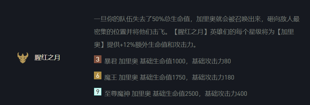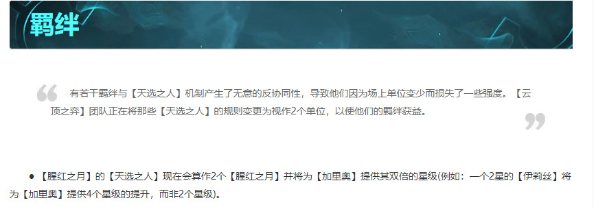 在10.22版本更新中对天选猩红羁绊进行了加强,天选猩红棋子被视为2个单位。这次改动让加里奥血量与攻击提升巨大,特别是前期拿到3猩红羁绊可以保证连胜,在当前版本更是前期强势的打工羁绊。