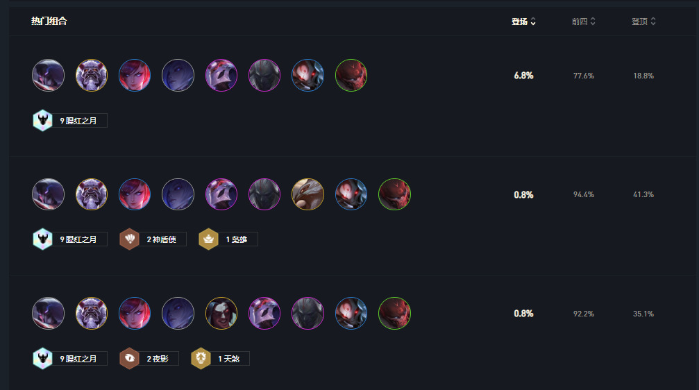 最近好多朋友问我,这版本太难了,有没有啥阵容能稳定烂分,开始摩昂的回答是靠运营走强势阵容,但有许多小伙伴说,我真的不会啊!之后摩昂就开始实验从最开始的三国,到抢不到寒冰的森林,在到今天的主角猩红之月!