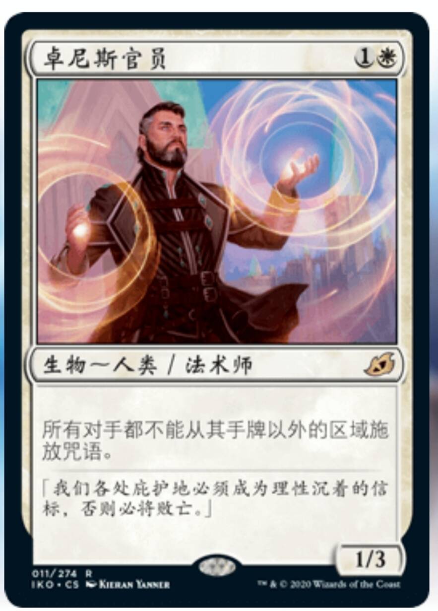 本套牌主要还是做前期管控,后续通过主将爆费出大威胁结束比赛的,所以生物不是大佬就是工具人,占比不多,就不一一分析了,除了辣个男人:卓尼斯官员。其实在官员跟腐食流浆面前我想了很久,最终还是用了官员,没办法,这哥太现代化了,以前白色哪有这种只控对面不锁自己的濑牌?