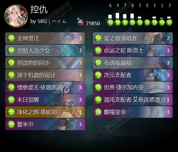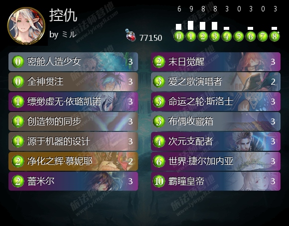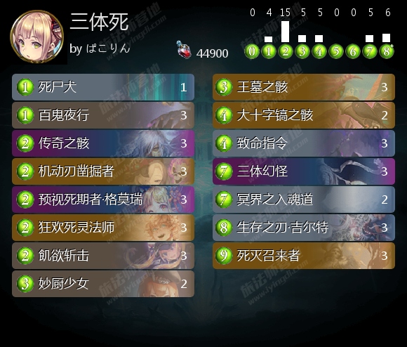 在三体死上,这套卡组采用了日本不太常见的死灭召来者构筑,主要还是为了回复。因为造物仇和守护教都没有什么伤害特别高的低费斩杀,所以ぱこりん 认为三体死可以为了解场效率留大怪解小怪,拿血量换解场。