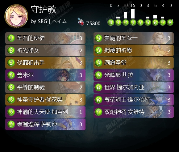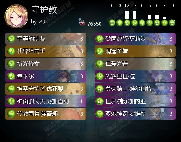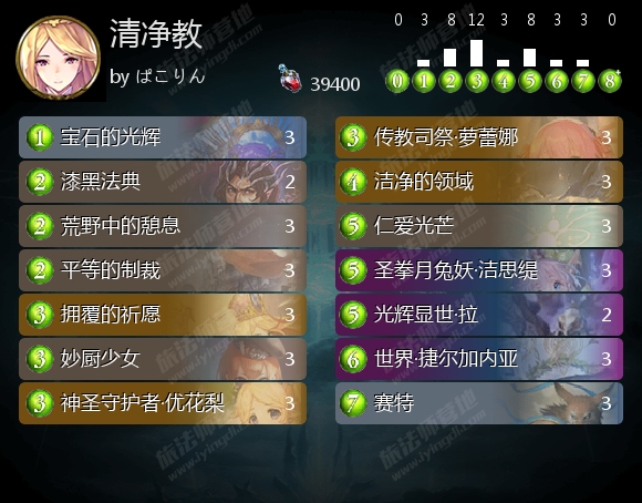 至于洁净教,由于洁净教和耶拉教不同,更偏向控制,回复牌的数量也比较少,因此ぱこりん 觉得洁净教的回复牌用起来要更节省一点,尽可能集中起来使用去追求一个回合两三次来铺场,没法奶三次的回合就捏住不打,只解场。