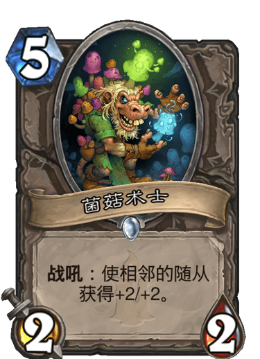 小型菌菇术士,不过在这个菌菇术士也难进狂野构筑的年代,它的前景同样不乐观。一费铺两个,二费准时上很强,相当于2费43的身材,还有两点冲锋伤害。只不过容易卡手,快攻德和偶数萨或许会带一张。