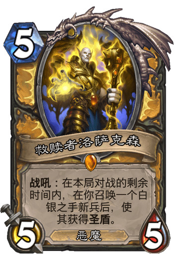 救赎者洛萨克森,这卡乍一看很强,其实却是奇数骑补强卡中最弱的一个,大家都在讨论它能不能进奇数骑构筑的问题。个人认为这卡比较鸡肋,食之无味弃之可惜。因为它属于锦上添花而不是雪中送炭。首先狂野的节奏很快,快攻内战五费下个55白板还是亏节奏的,其次还要五费能准时摸到它才行。这卡的意义在于提高奇数骑的韧性,使其对阵控制卡组时能有更强的后期能力,属于提高卡组上限的。